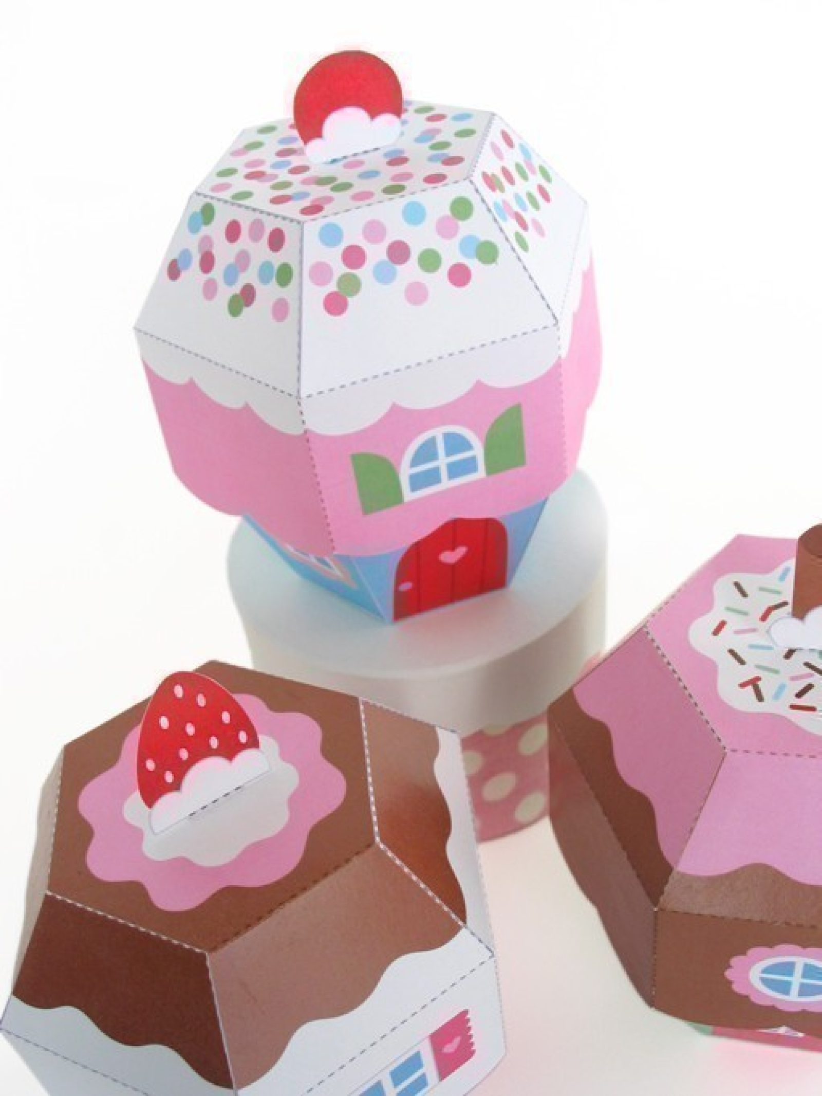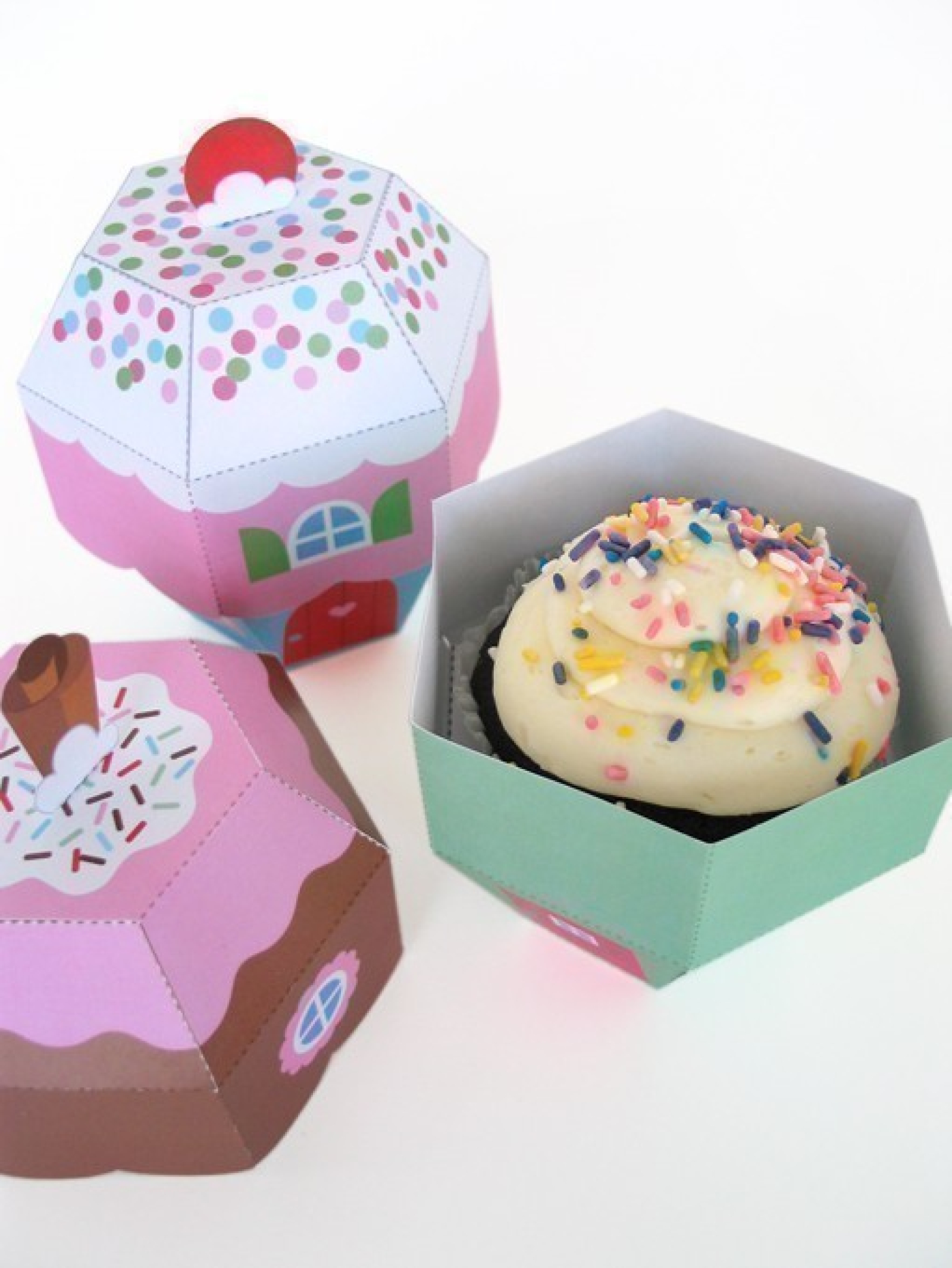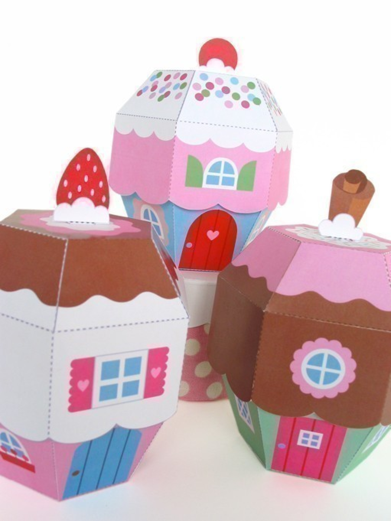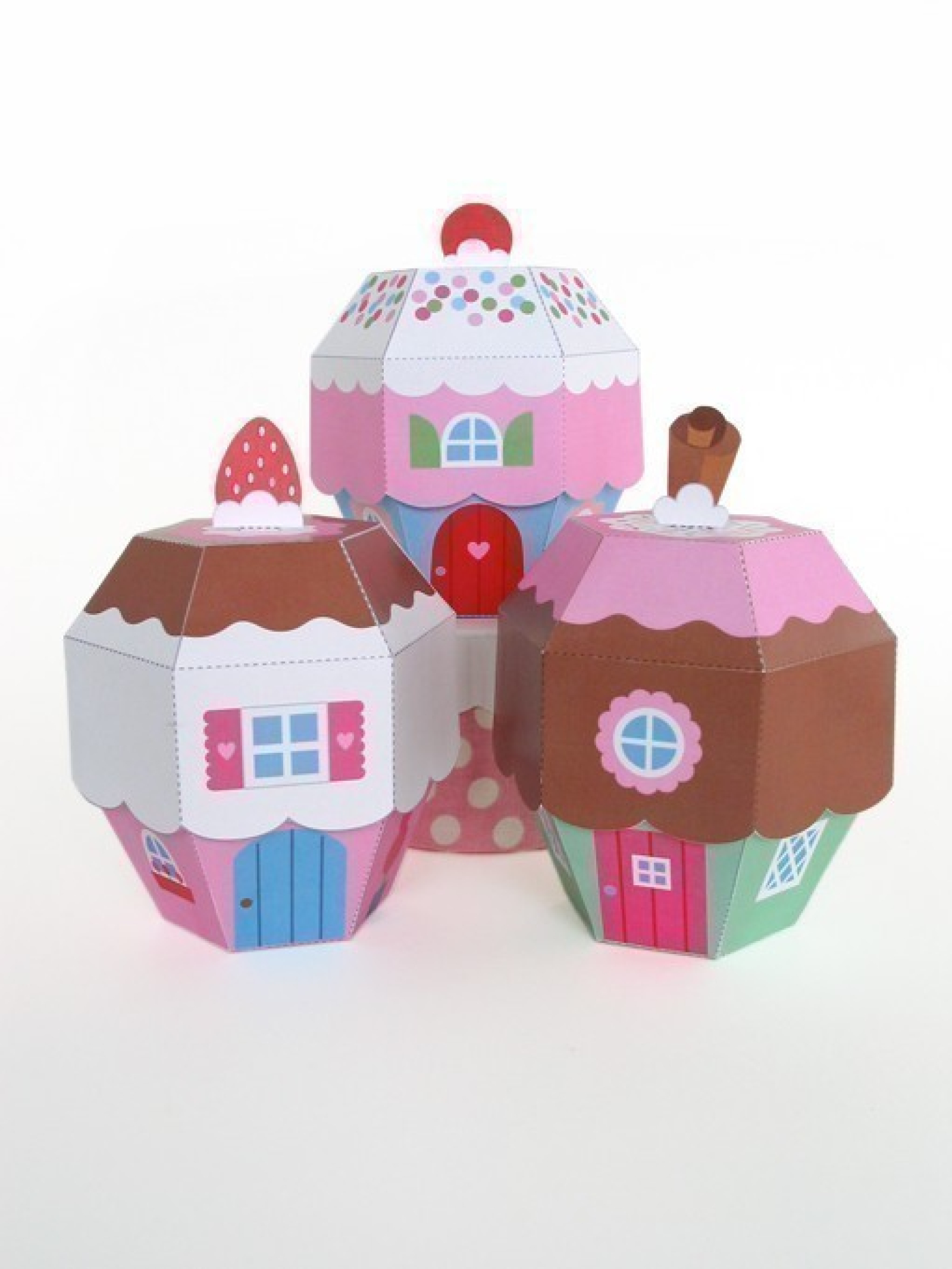 How delicious! Three yummy cupcake cottages from Cupcake Lane. Kit includes three cupcake cottage favor boxes that can be used to hold novelties or even as a cupcake box. Great gift box for a birthday party!