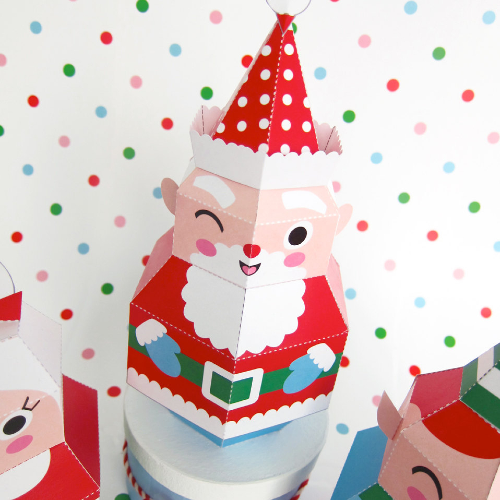 A fun paper craft project you can print from your home computer and make yourself. This 10 page PDF kit includes 3 treat boxes: Santa, Mrs. Claus and elf. Instructions included.